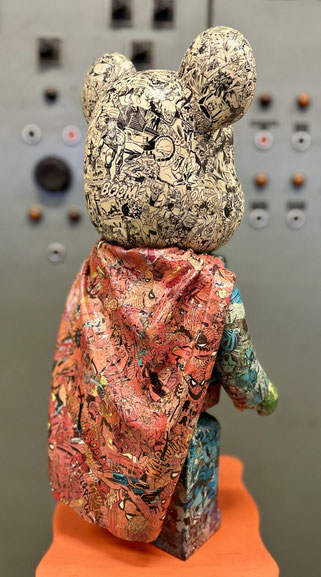 Deze unieke Bearbrick is getransformeerd tot een artistiek statement, volledig beplakt met zorgvuldig geselecteerde fragmenten uit vintage stripboeken. Elk paneel vertelt een verhaal – rauw, dynamisch en nostalgisch – waardoor het object een gelaagde visuele spanning krijgt. De toevoeging van een handgemaakte cape, afgewerkt met een glanzende epoxylaag, versterkt het superheldenkarakter en tilt het geheel naar een sculpturale dimensie. Dit werk is niet alleen een eerbetoon aan de klassieke stripcultuur, maar ook een speelse confrontatie tussen popart en hedendaags design.